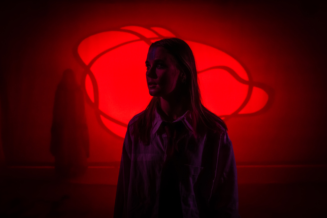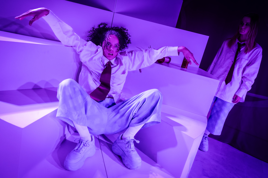 "Det vita scenrummet, med bara af Klint-inspirerade linjer slingrande i fonden, ger utrymme för färg och formförsök."